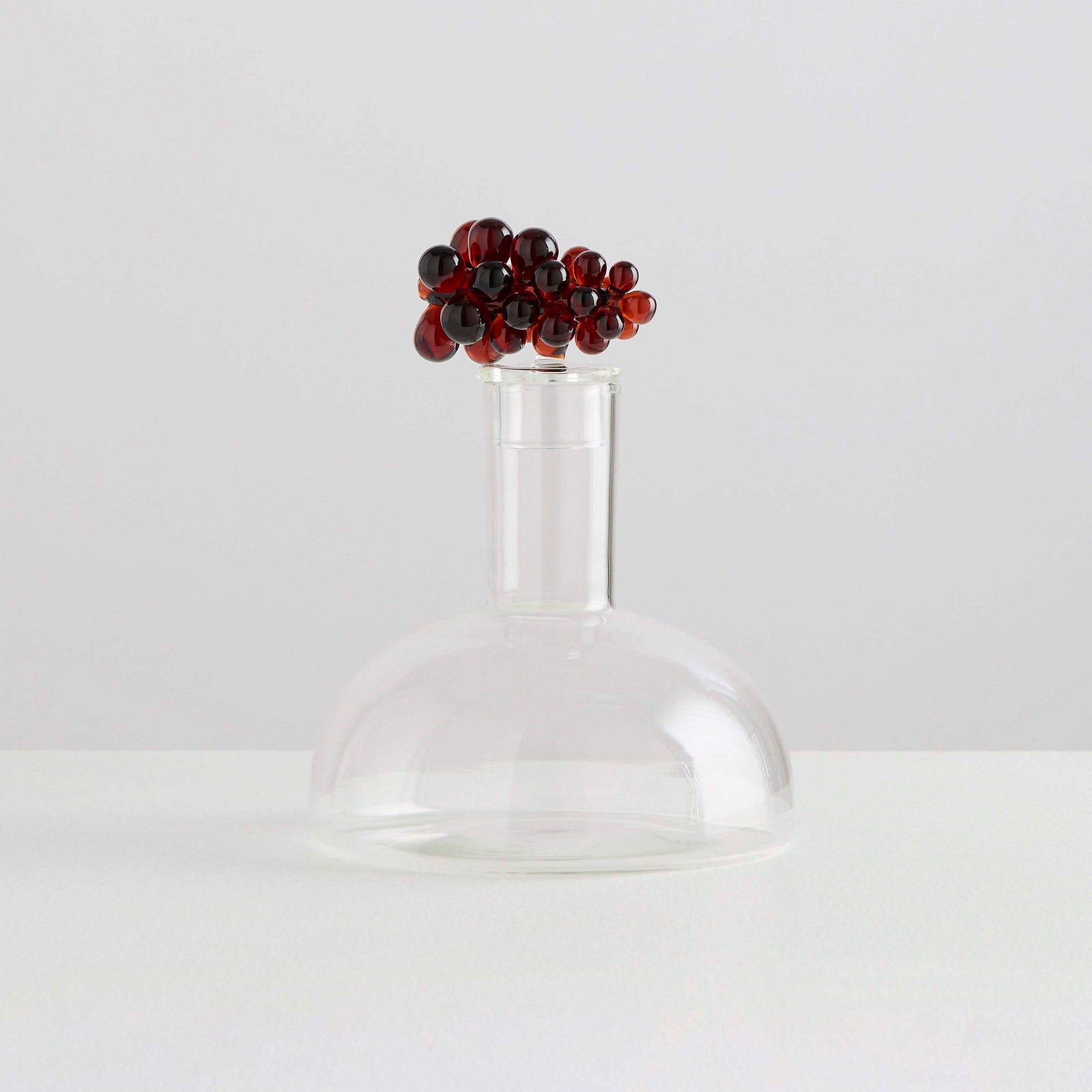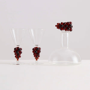 This gift set includes one decanter with an ornate lid and two wine glasses decorated with glass grapes.