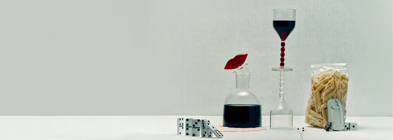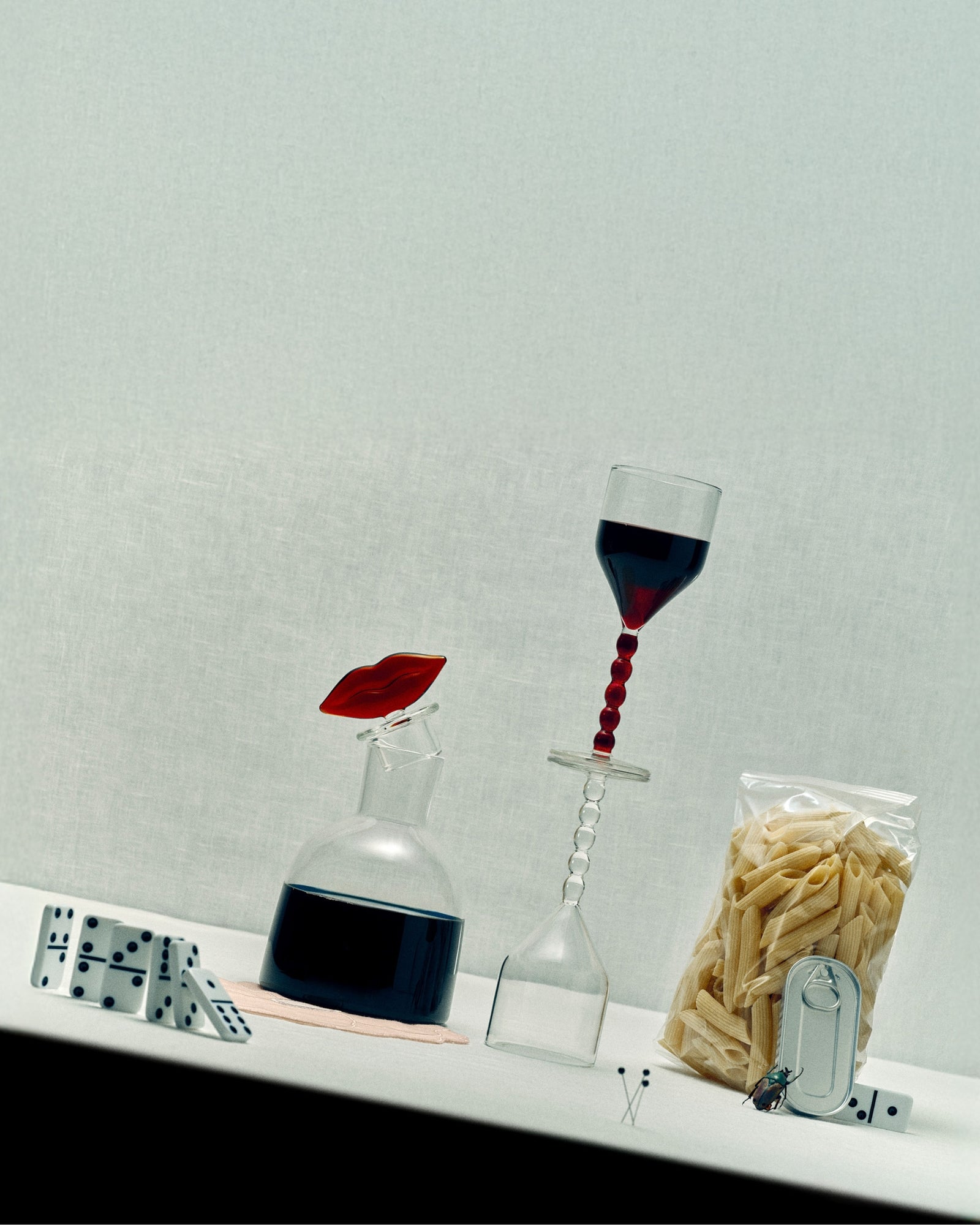 Bold lips become sculptural motifs, linen roses bloom with imagination, and trompe-l’œil pearls become the stems of elegant wine glasses.