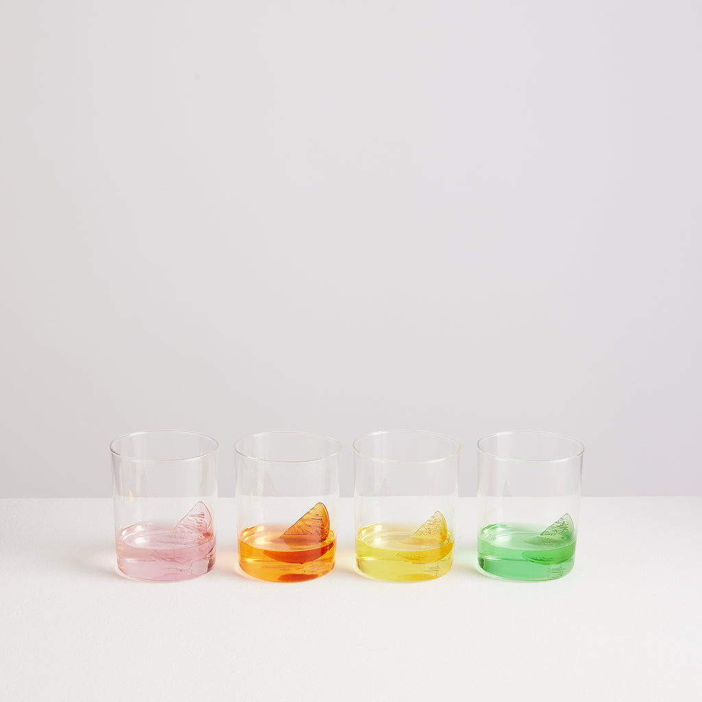Here is a symphony of surreal citrus! Each gobelet holds in its heart an everlasting slice of fruit: a lemon, a lime, an orange and a grapefruit. Handcrafted from borosilicate glass, this set of four drinking glasses combine playful design with everyday function, perfect for water, cocktails or fresh juice. Together they make our dream orchard...